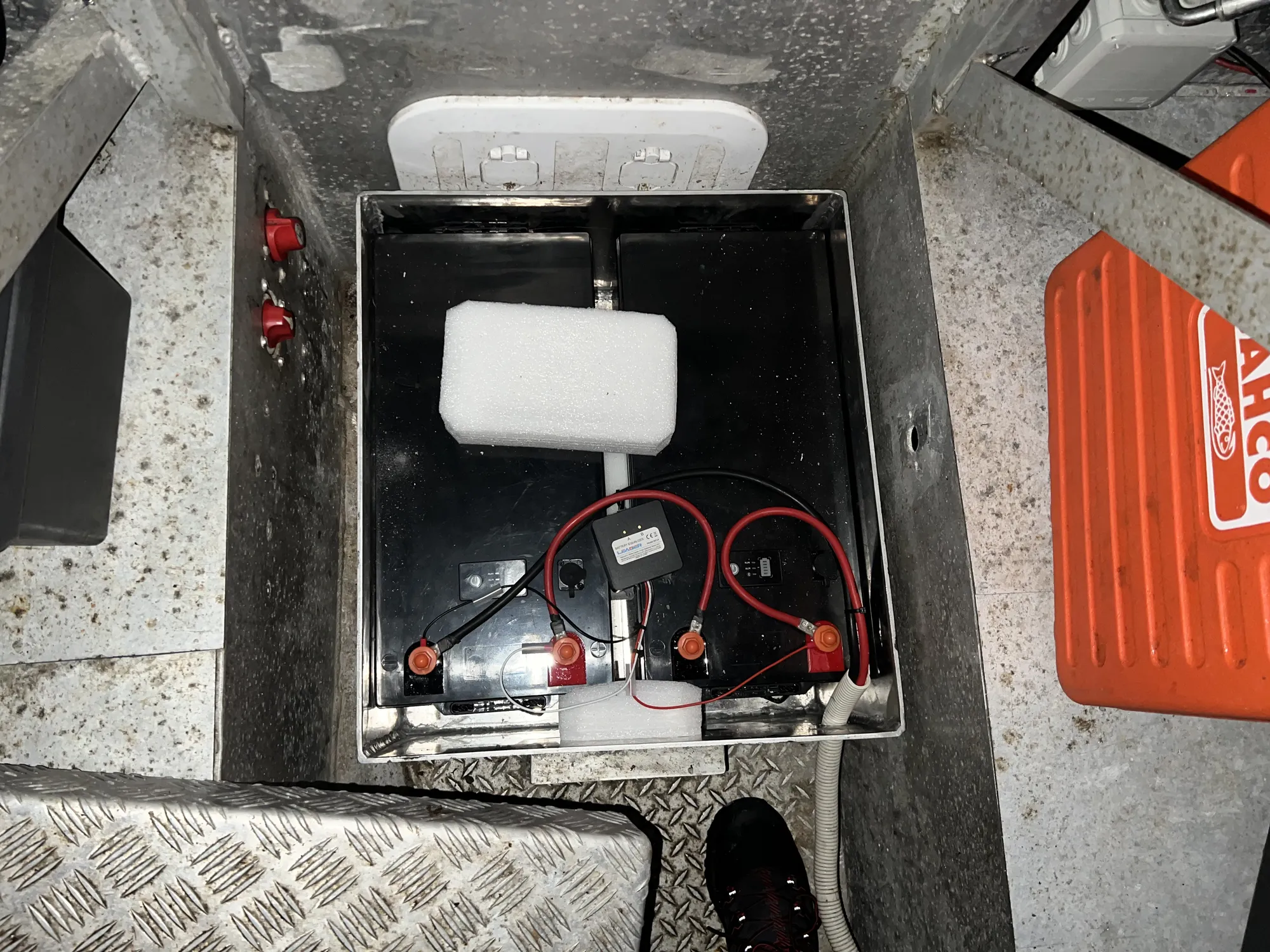 Båten har separat 24V litiumbatteribank (310Ah) som driver juksamaskiner, hydraulikk og baugmotor – slik kan man fiske hele dagen med avslått hovedmotor.