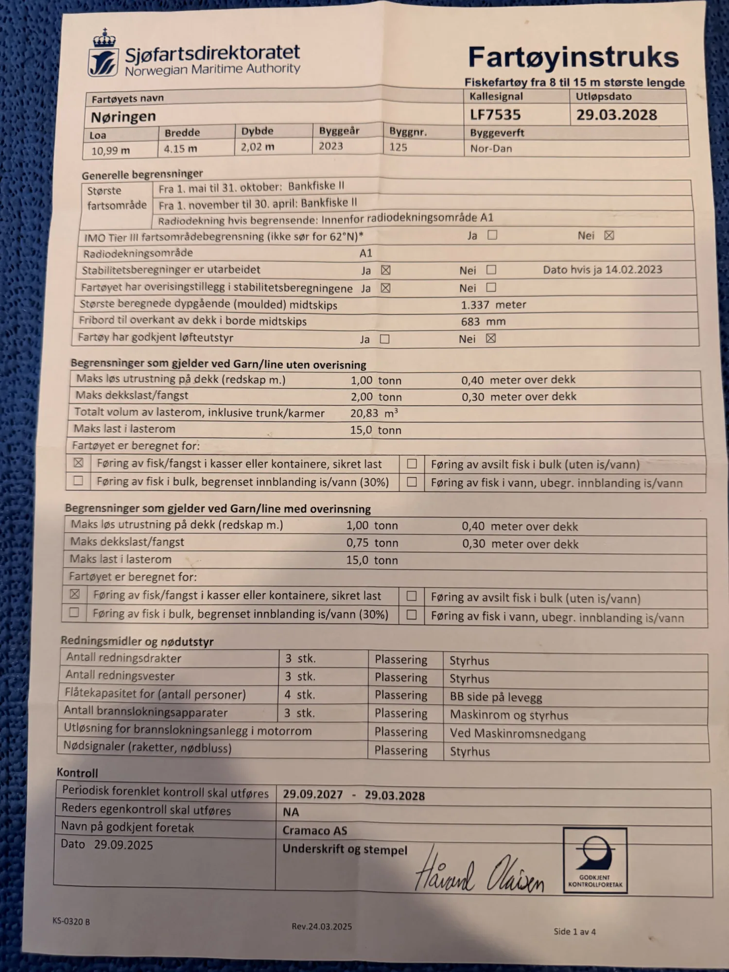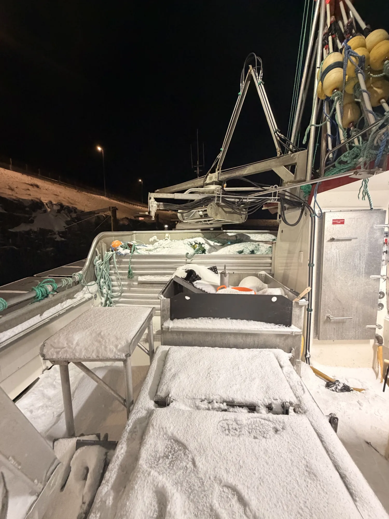 Fartøyet har vært rigget for trommelline. Det er forsterket 2 stk plater i hekk hvor trommel tidligere sto. God dekksplass. Lang garnrenne med luke for lett adkomst. God plass på hekk.