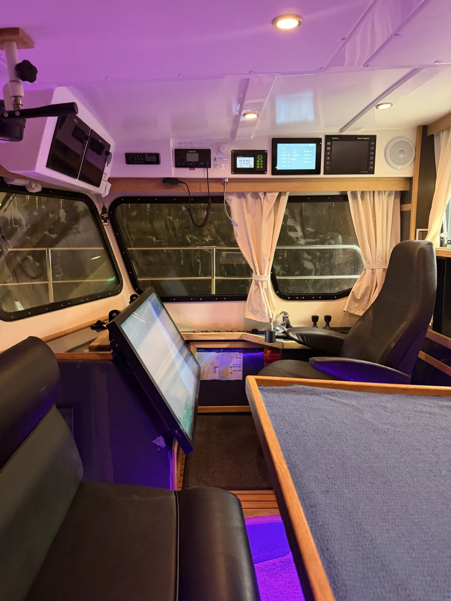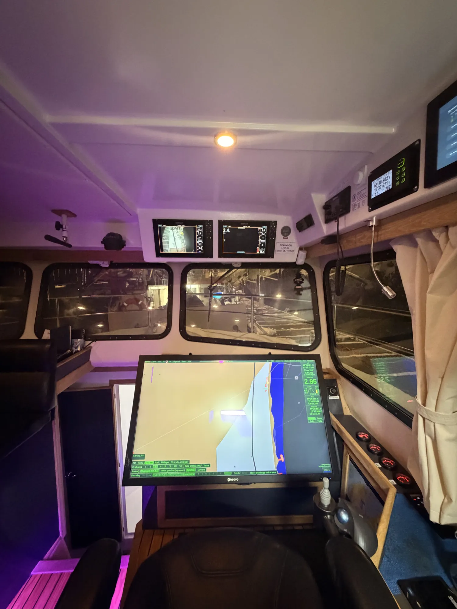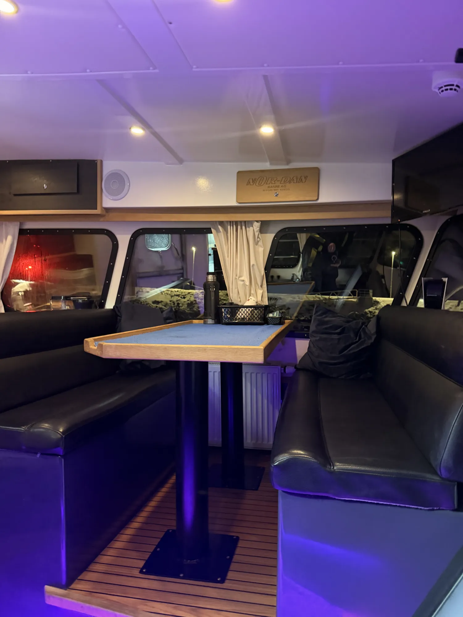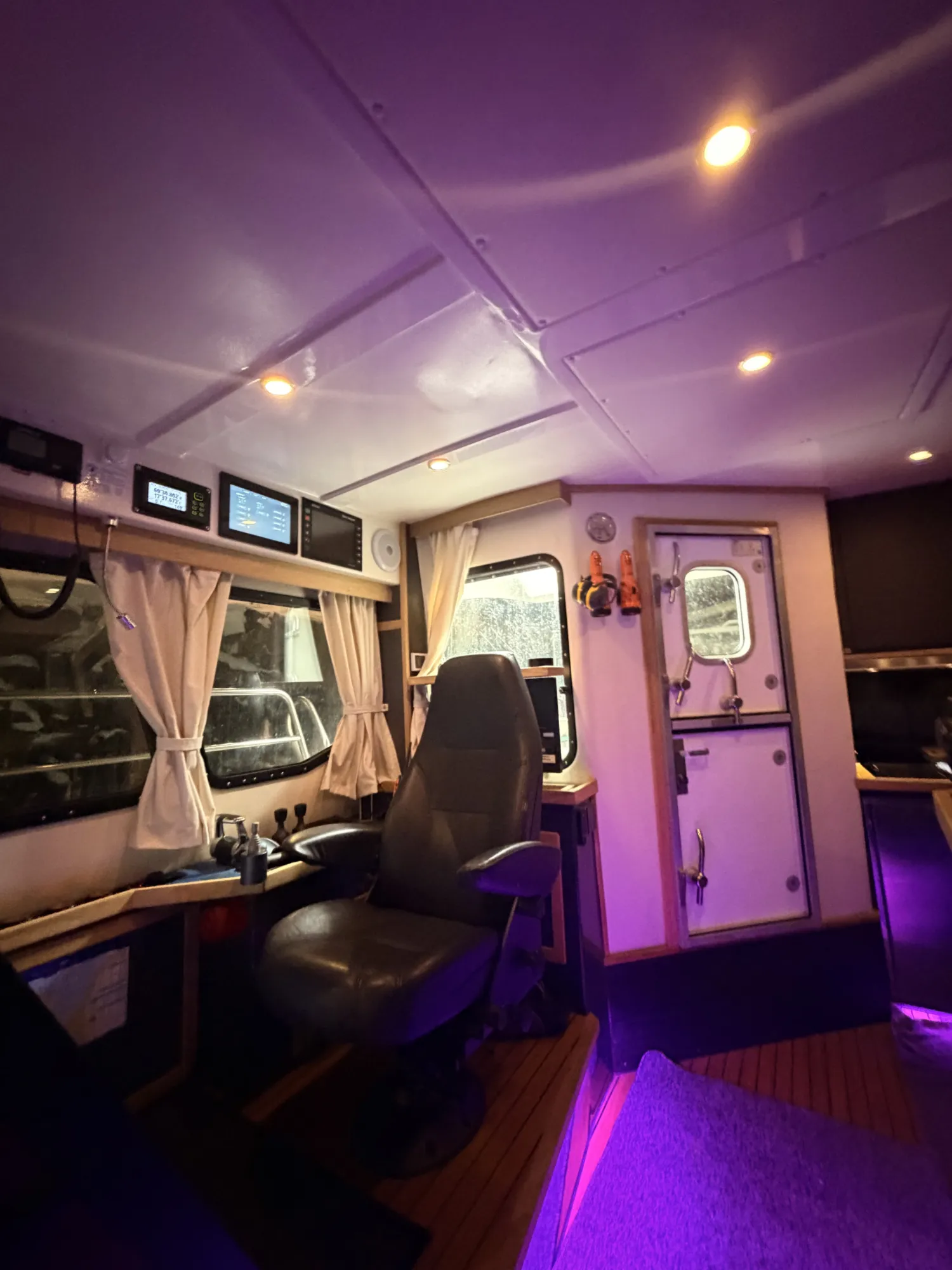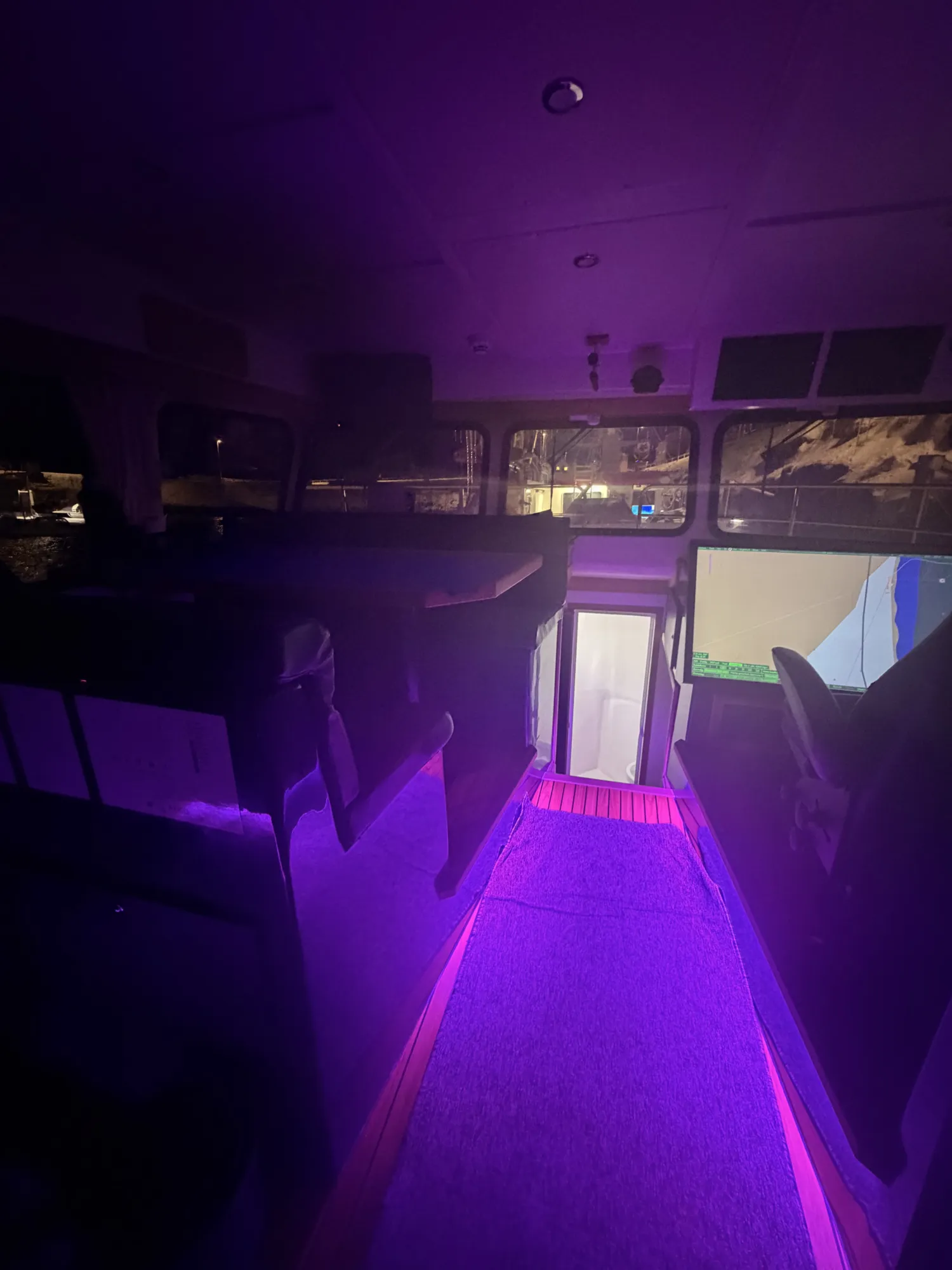 Stemningsfull belysning med RGB LED-lys i dørk i styrhus, med mulighet for dimming og fargevalg. Downlights i tak, styrt via egen bryter.