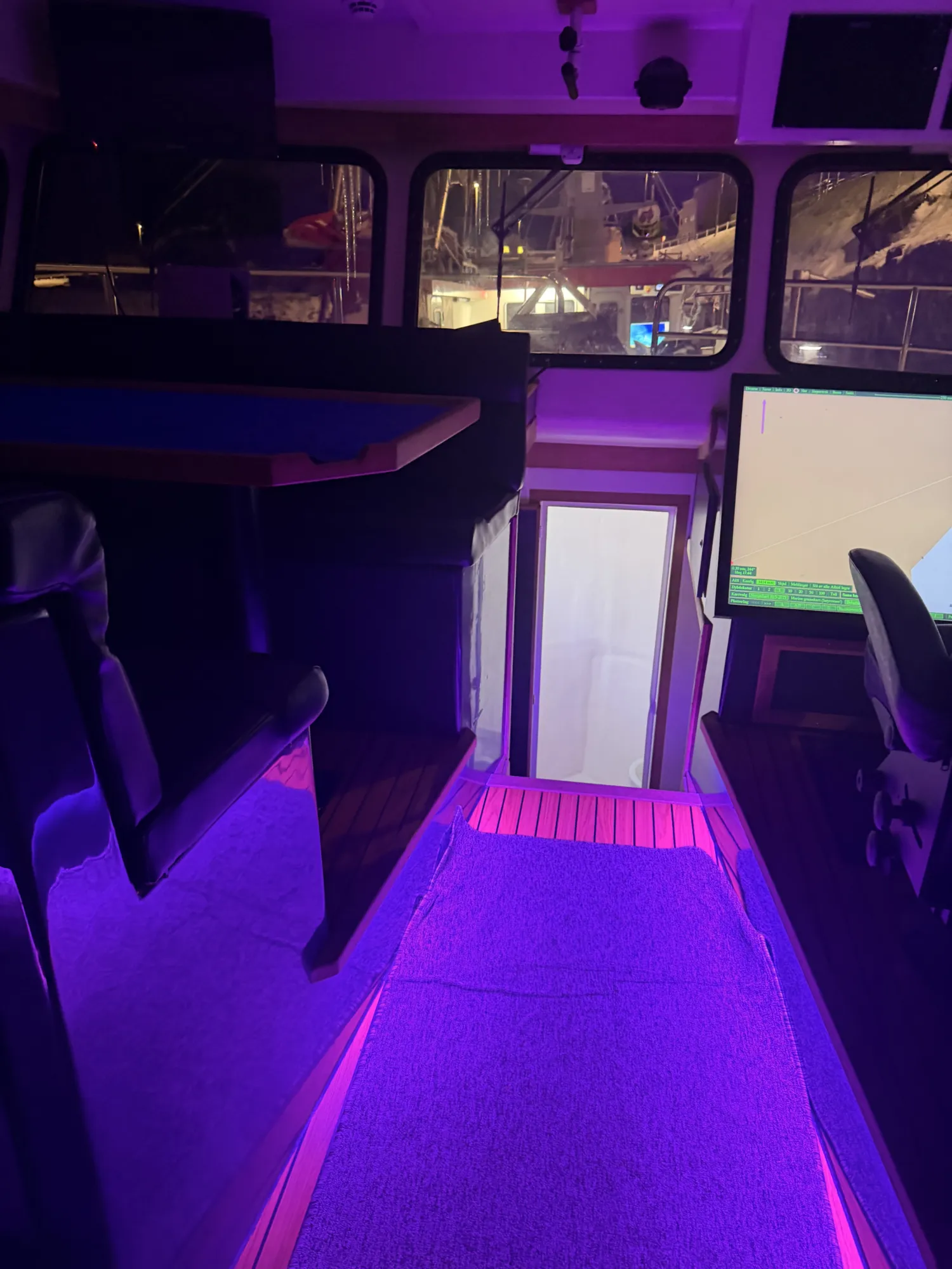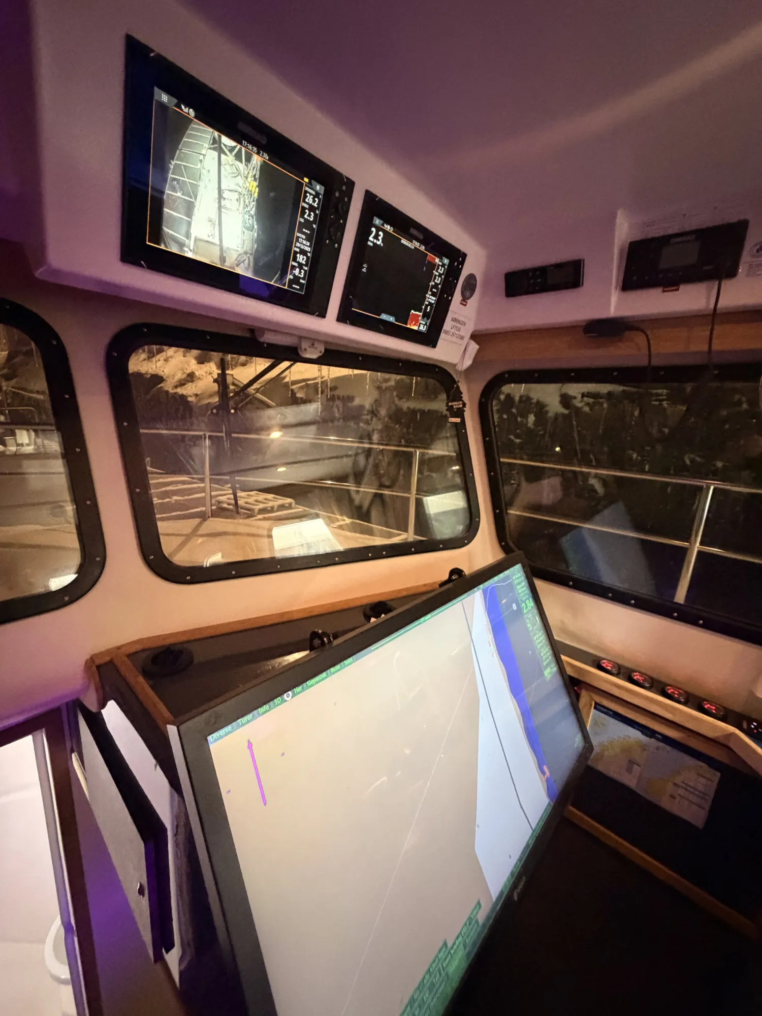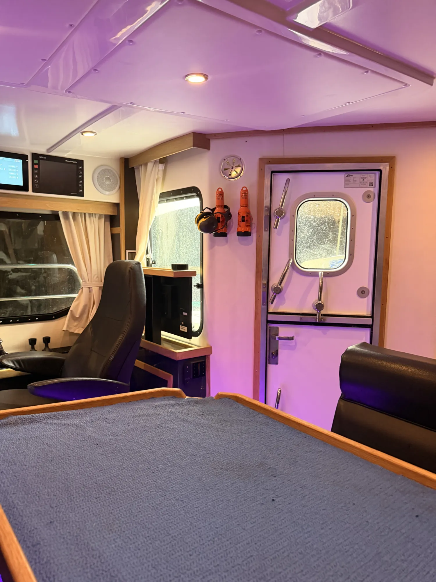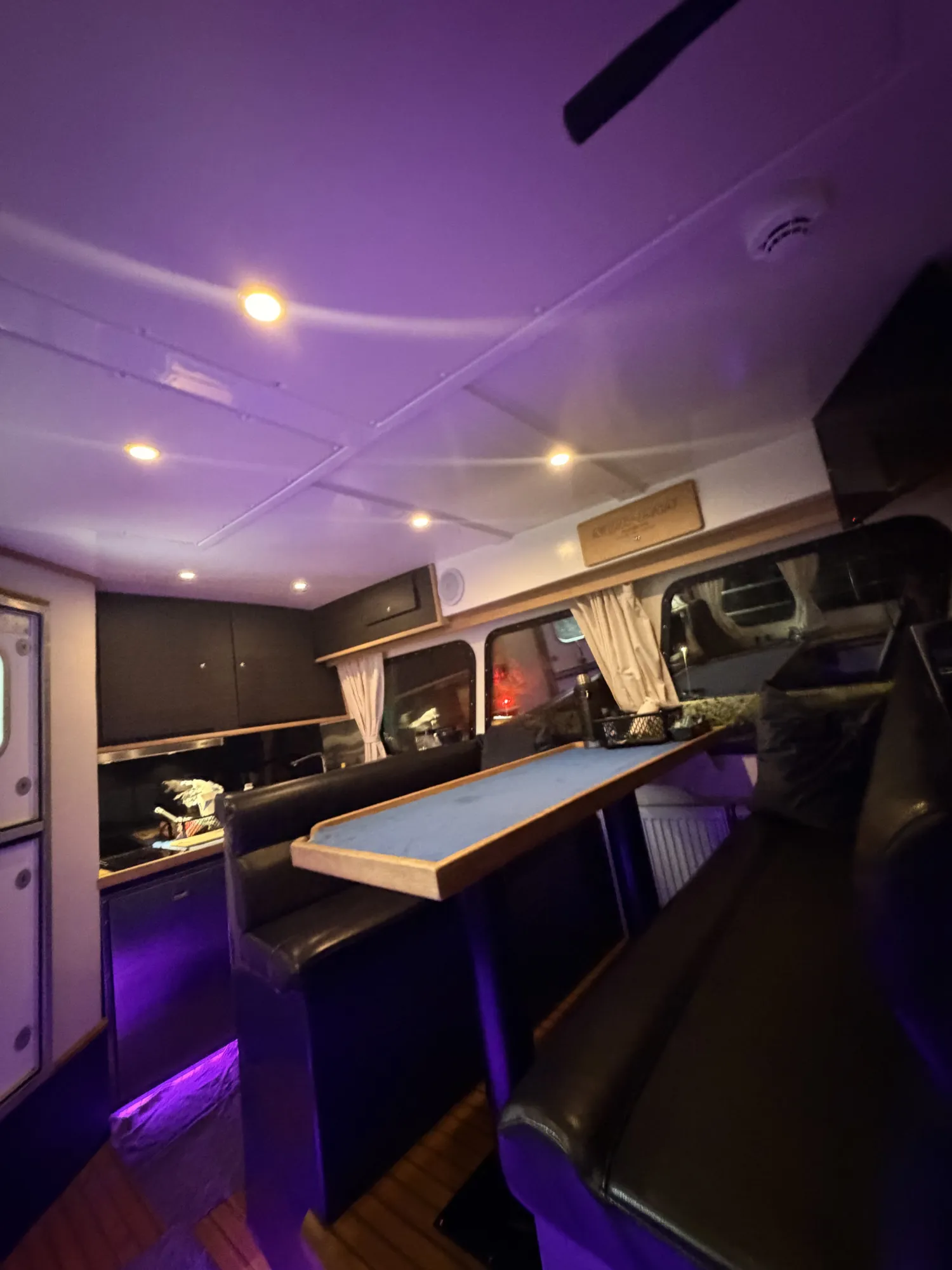Stemningsfull belysning med RGB LED-lys i dørk i styrhus, med mulighet for dimming og fargevalg. Downlights i tak, styrt via egen bryter.