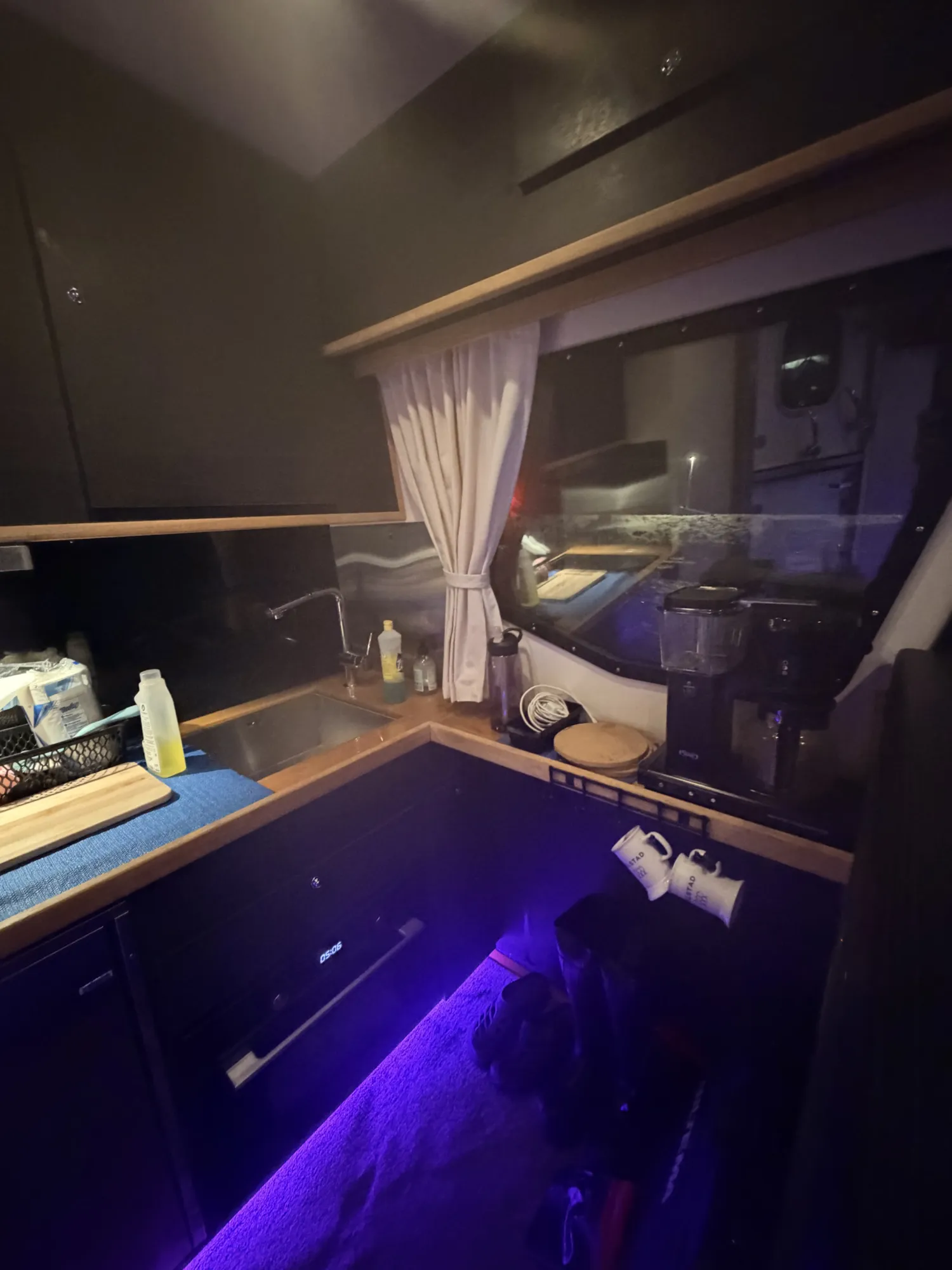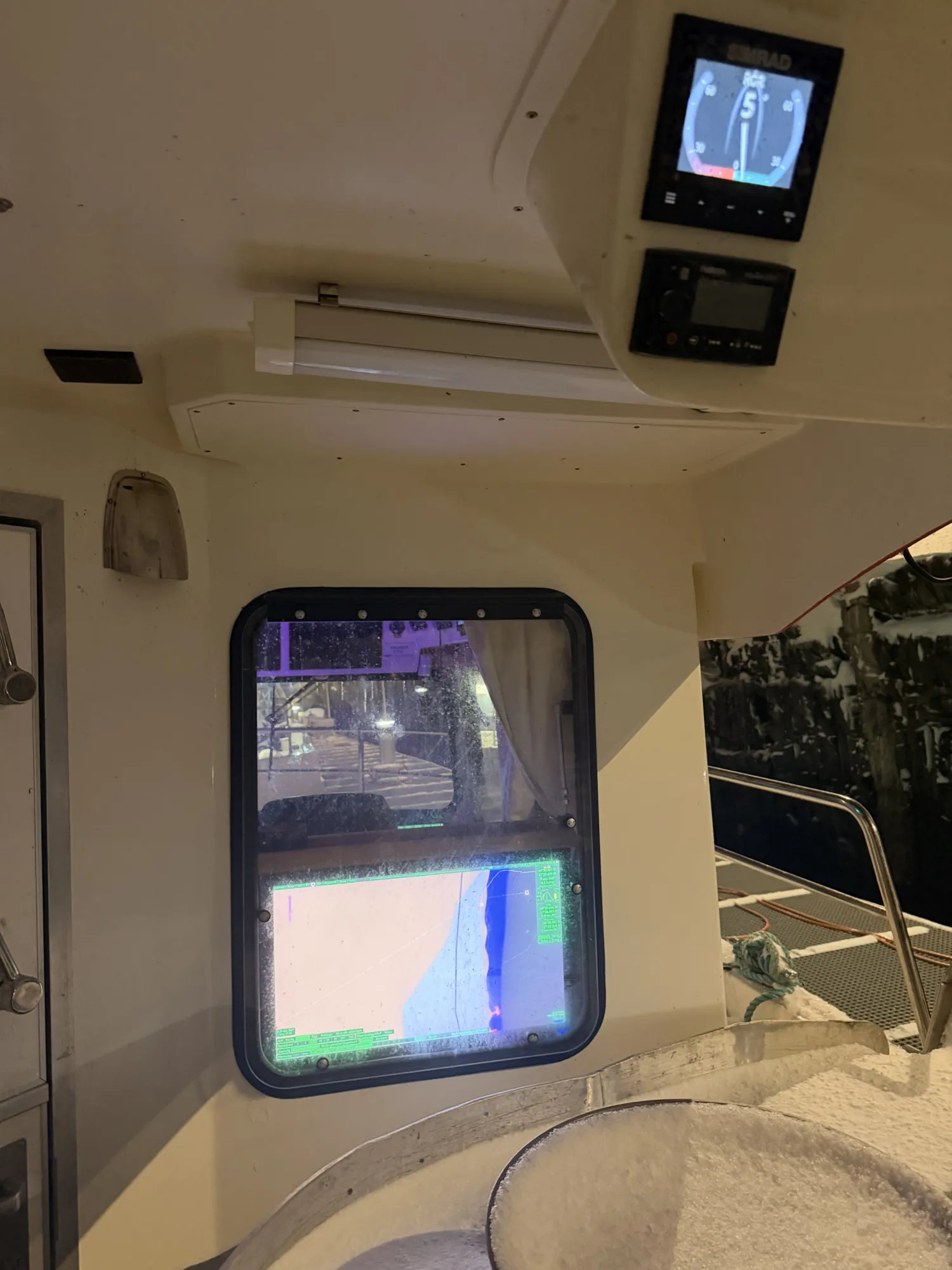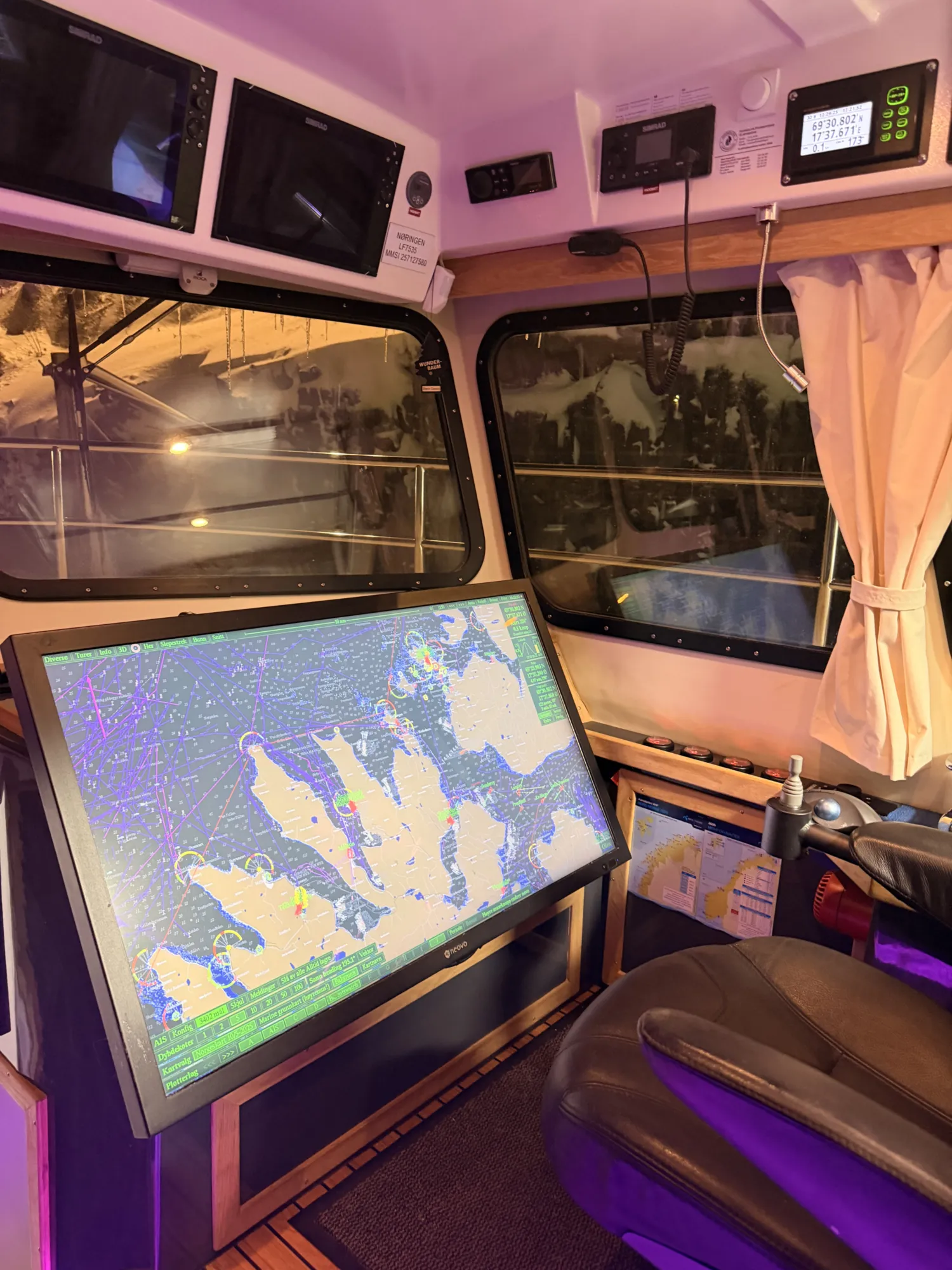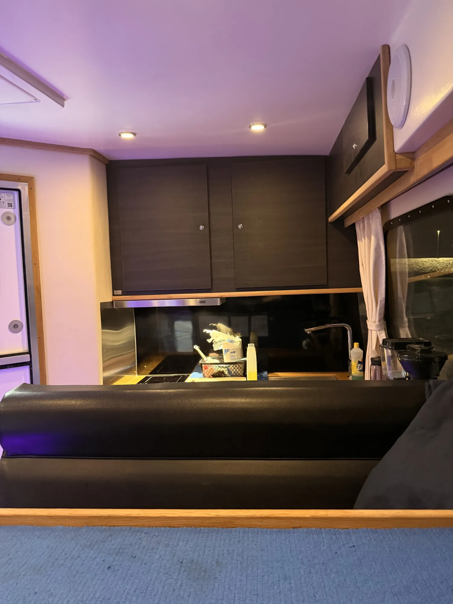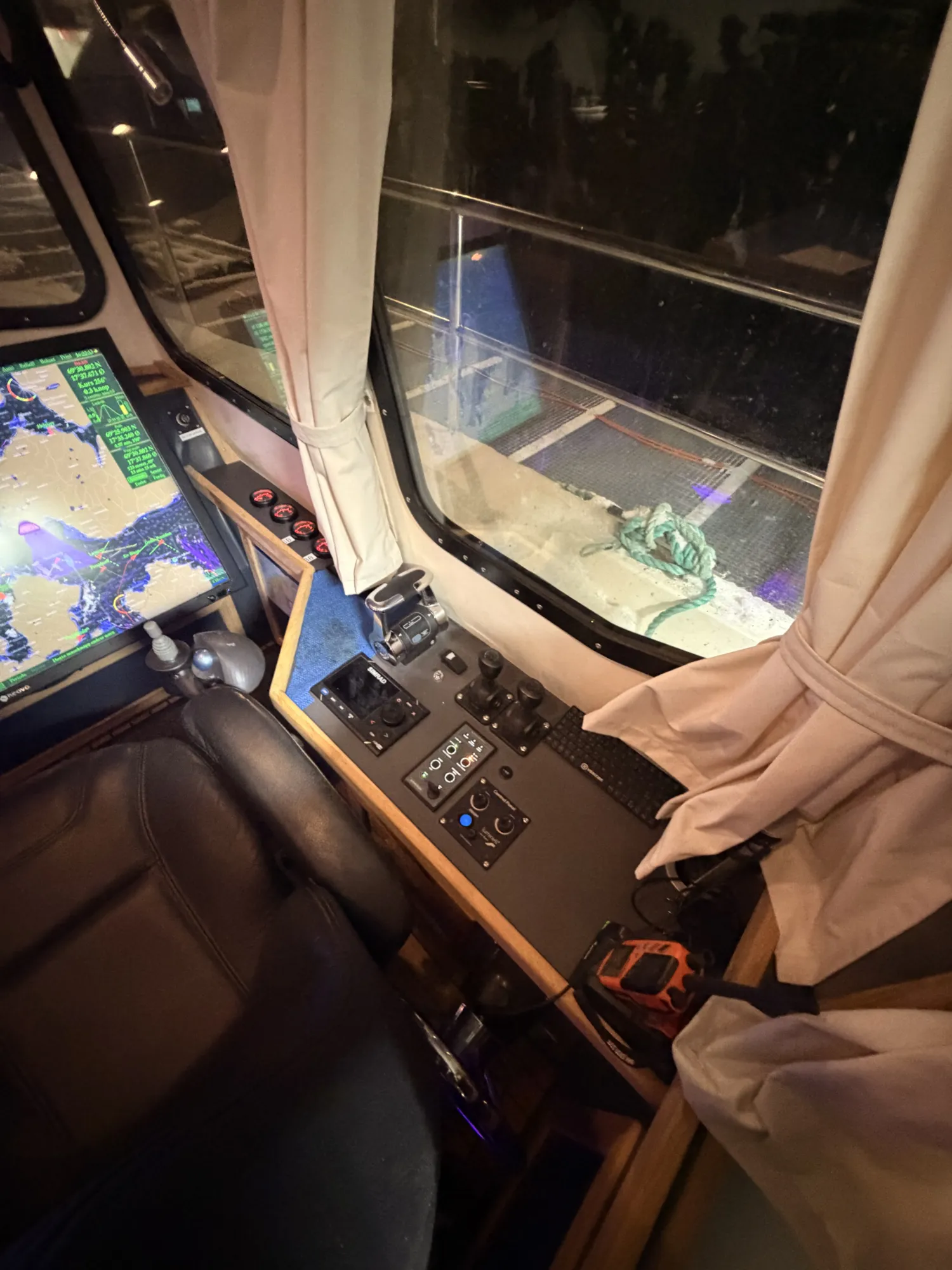 Stemningsfull belysning med RGB LED-lys i dørk i styrhus, med mulighet for dimming og fargevalg. Downlights i tak, styrt via egen bryter.
