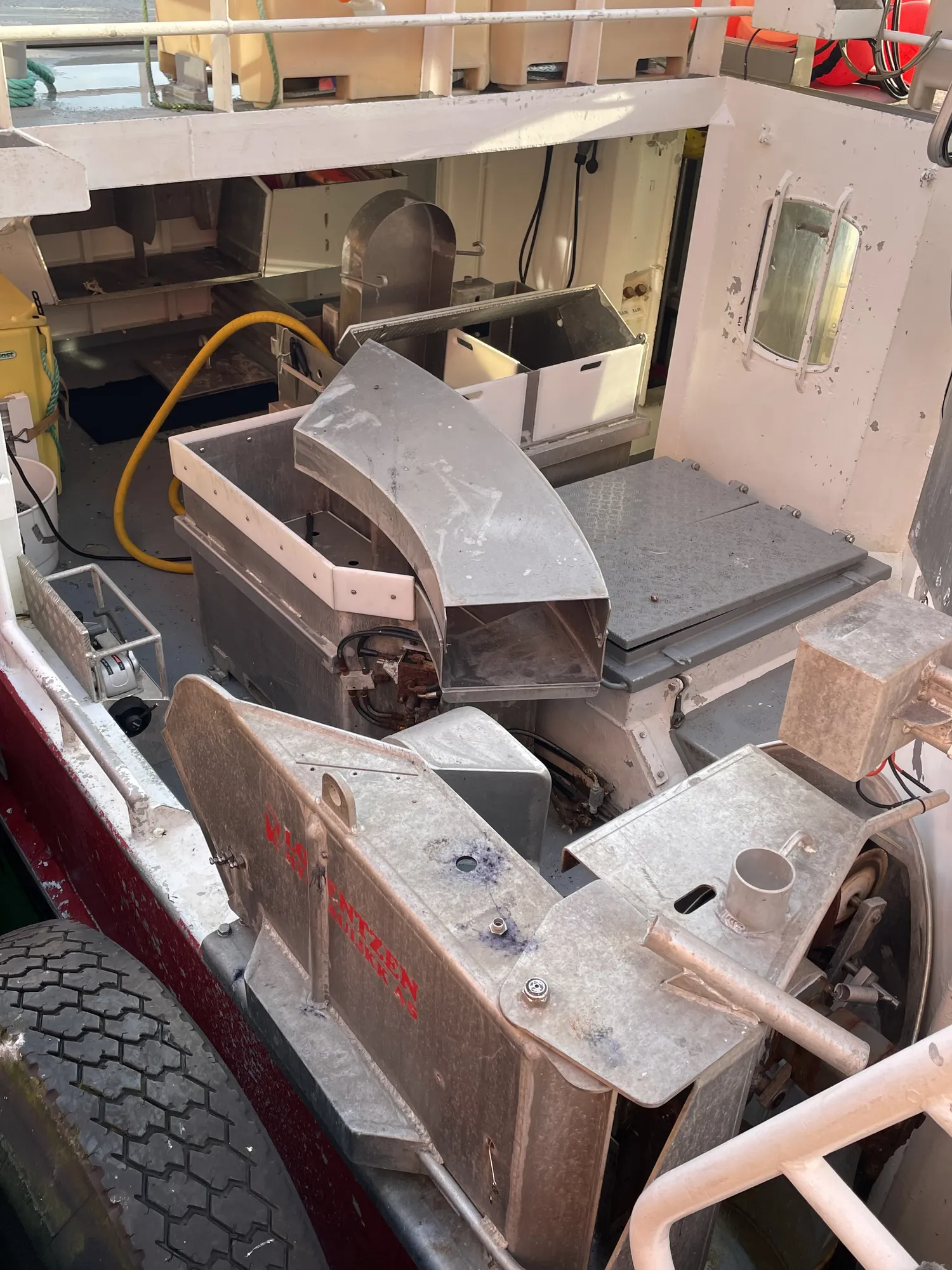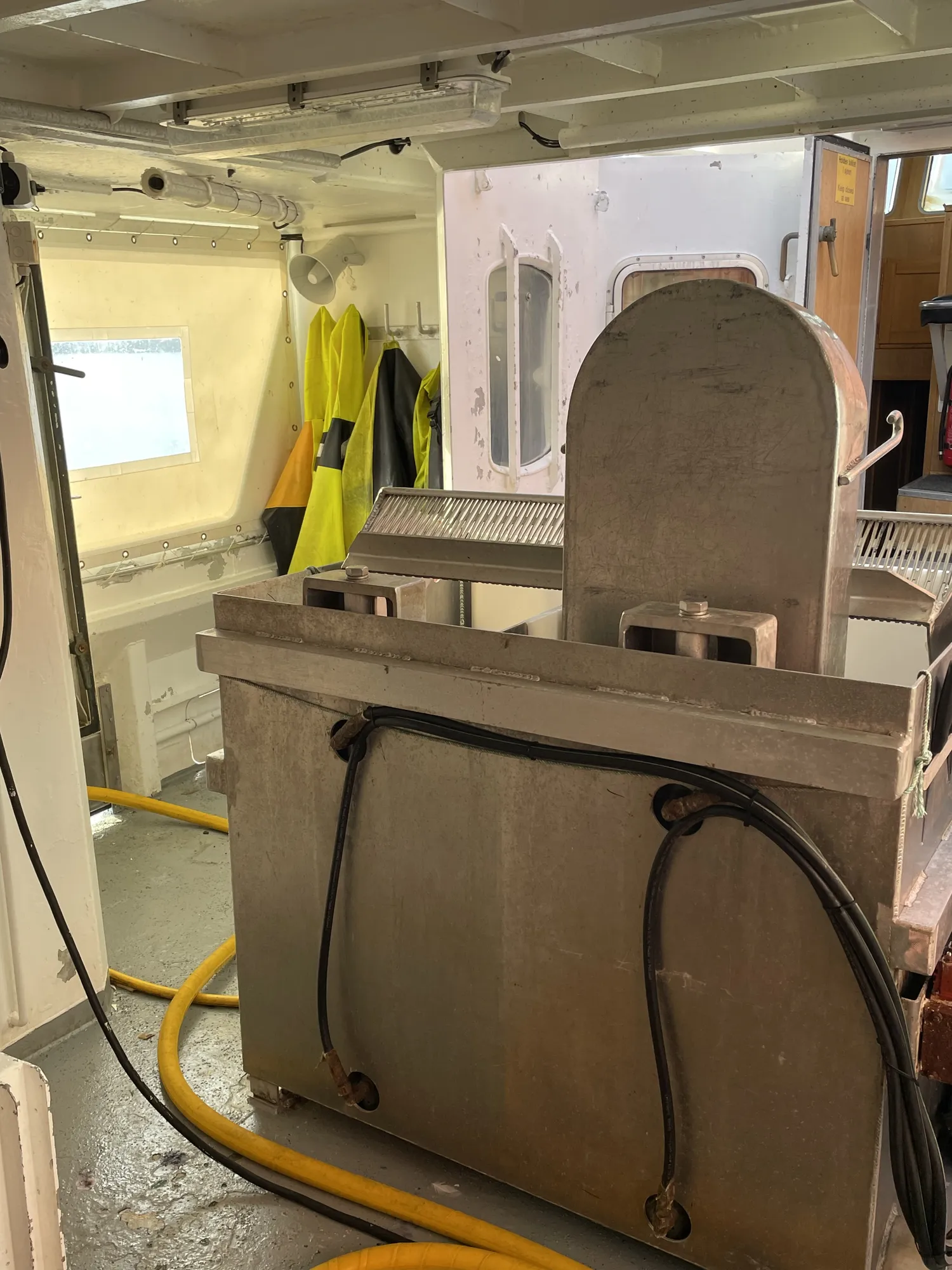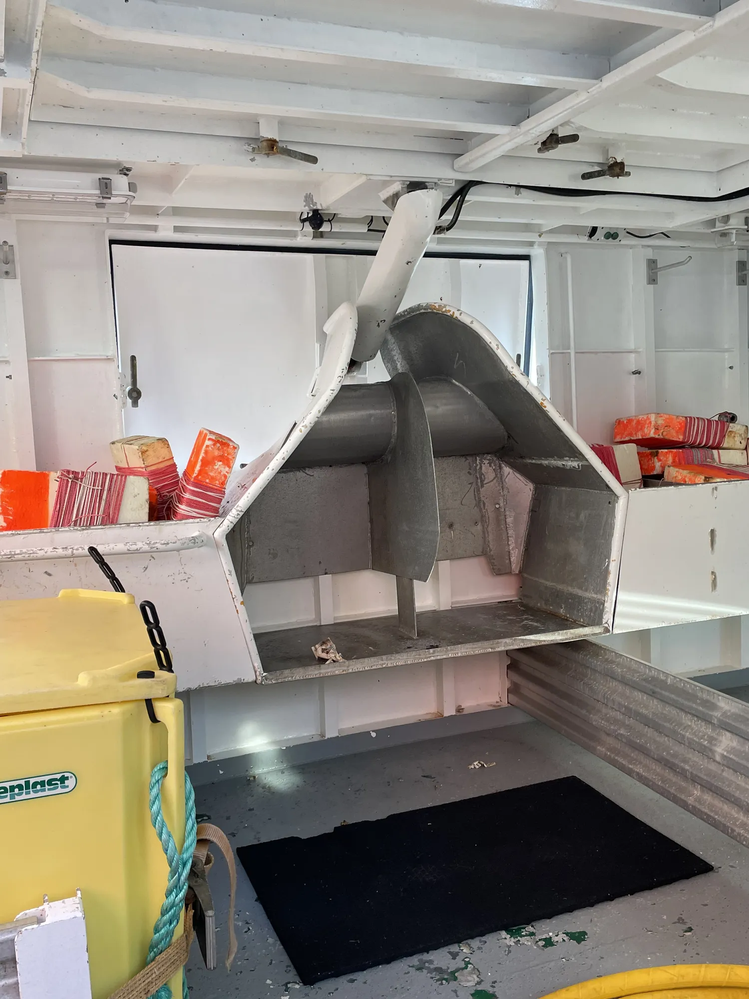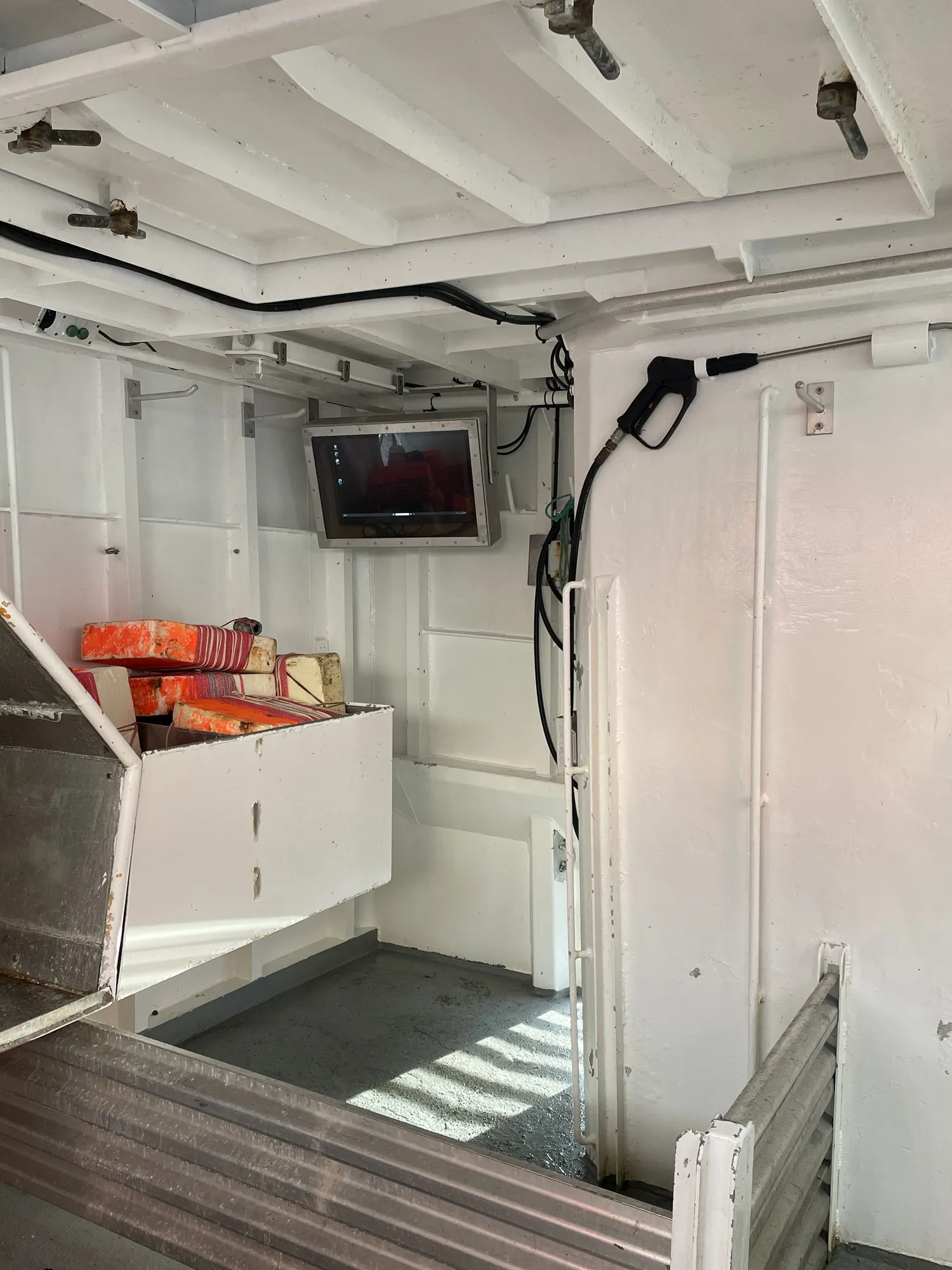 Aluminiums kontainere: 8 store + 6 små i rommet. Ca 7 tonn hvitfisk